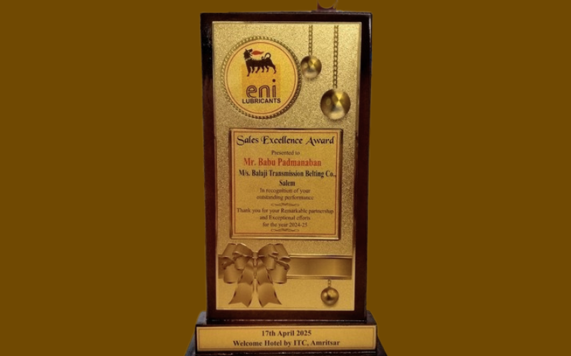 We are proud to announce that Mr. Babu Padmanaban of Balaji Transmission Belting Co., Salem has been honored with the Sales Excellence Award by Eni Lubricants for his outstanding performance and exceptional efforts in the year 2024–2025.